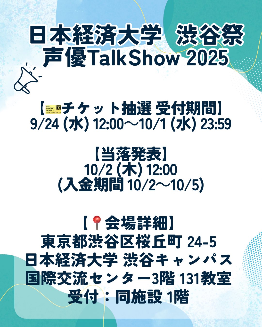 渋谷祭は2日間開催されます! 大学院【246ホール】とマリア館3F【131教室】は別の建物です! 1日目 – 10/28(土曜日) 大学院 【246ホール】 10:30 ー 10:45 開会式 10:45 ー 11:00 ダンス授業1 11:15 ー 11:30 ぷらいむショーケース 11:45 ー 12:15 ベトナムのダンス(V-Artists in Tokyo) 13:15 ー 13:45 バンド演奏・良悪世界 14:00 ー 14:30 ダンス授業2 14:45 ー 14:55 BLUE ROSE 15:10 ー 15:30 Konoka & DJ pinestone ライブ 15:30 ー 17:00 DJ マリア館3F 【131教室】 14:30 ー 16:00 声優トークショー 2日目 – 10/29(日曜日) 大学院 【246ホール】 10:15 ー 10:35 ダンス部fire babies 11:00 ー 13:30 2023年度留学生日本語スピーチコンテスト 14:00 ー 17:00 tvk「秘密結社 lol-planets」公開収録&スペシャルライブ マリア館3F 【131教室】 渋谷祭 eスポーツ大会